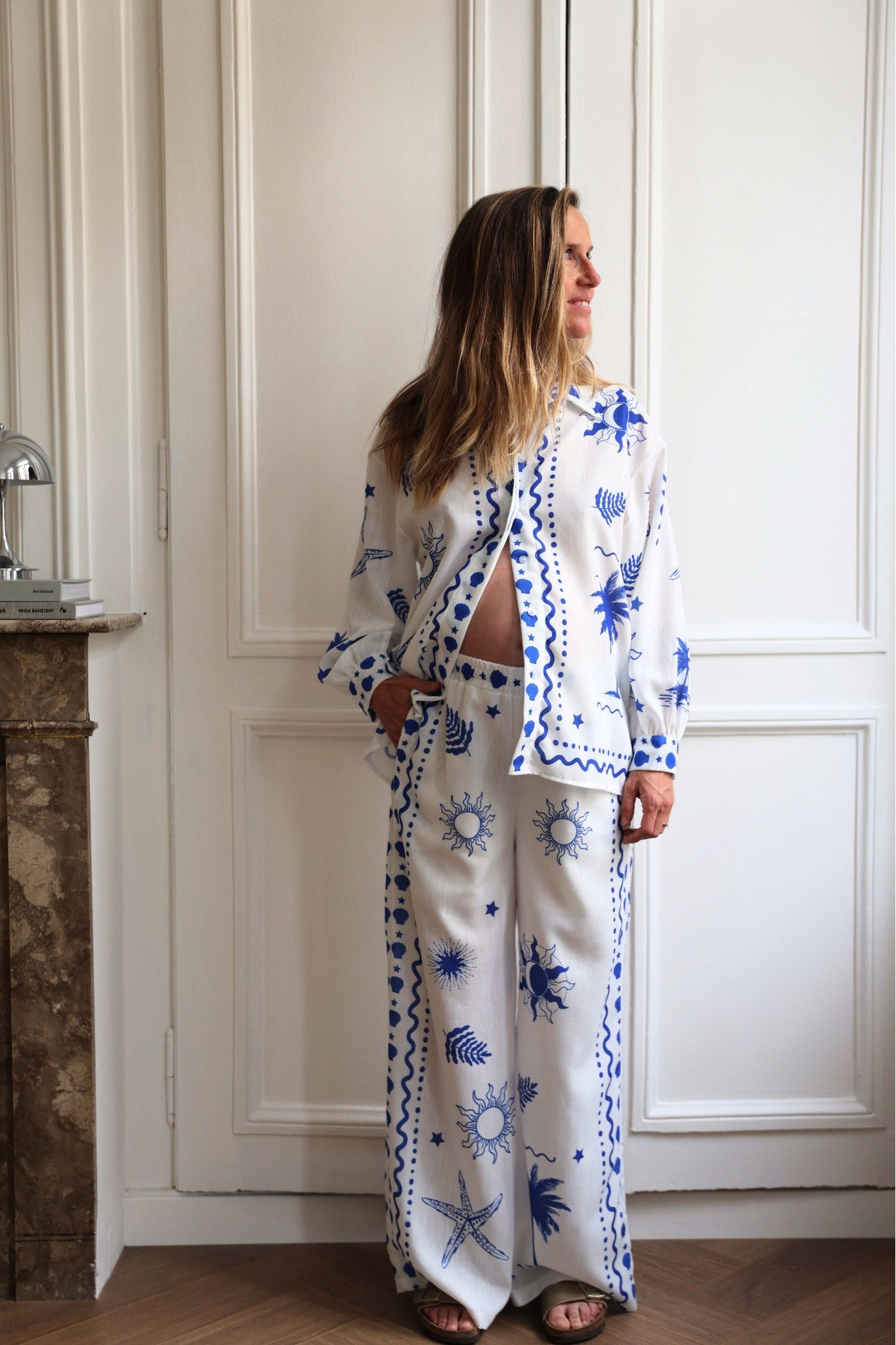 Léger et agréable à porter, le pantalon Madeline séduit par sa coupe droite fluide et son imprimé contrasté. Doté d’une taille élastiquée, il allie confort et style. À porter seul ou en total look avec la chemise assortie.